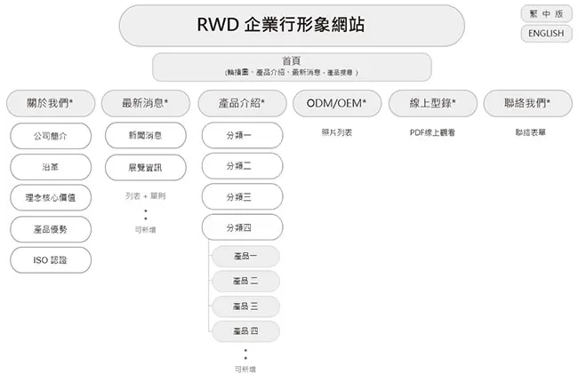 以企業形象型的網站為例,基本網站結構的參考: