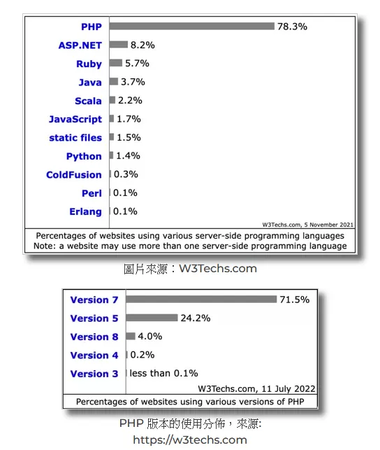 PHP 自 7.x 版本開始,效率是翻倍提升。有將近 80% 的網站使用 PHP 開發。